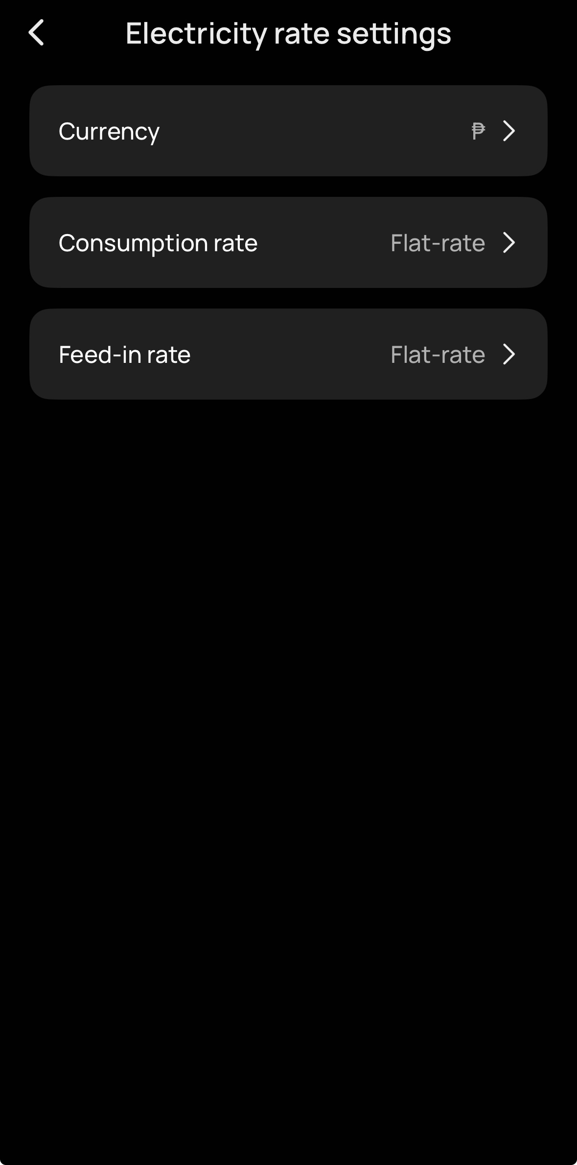 | Electricity rate settings | Currency ₱Consumption rate Flat-rate Rate Unit price ₱13.2703 at the time of publishing this page, Meralco charges ₱13.2703 per kWhFeed-in rate Flat-rate Fixed rate ₱0.00001 since there is no net metering setup, I set this to the smallest value to be irrelevant. |