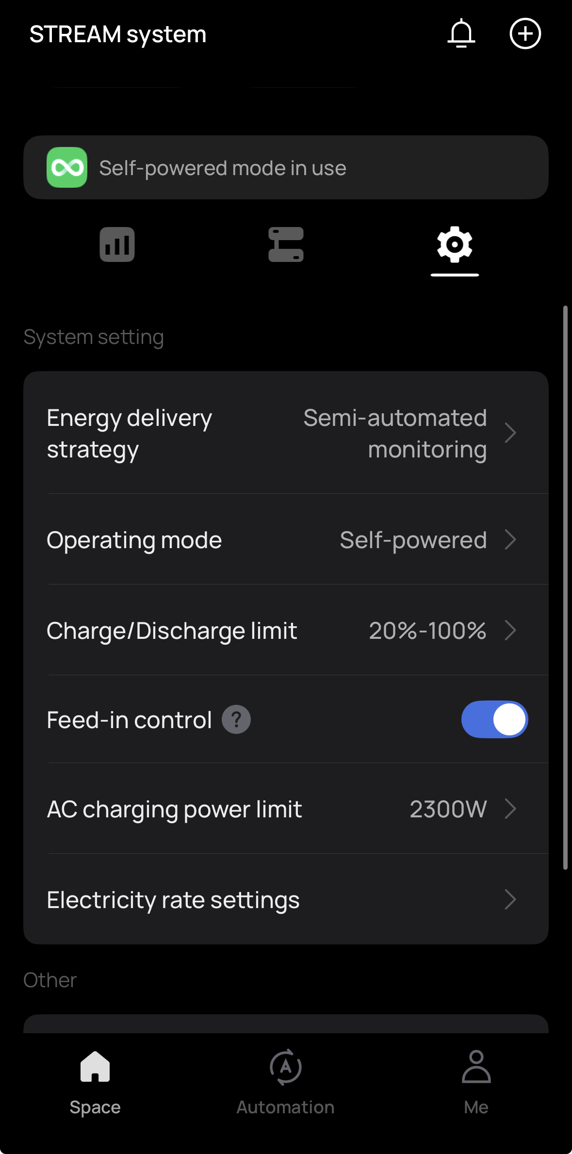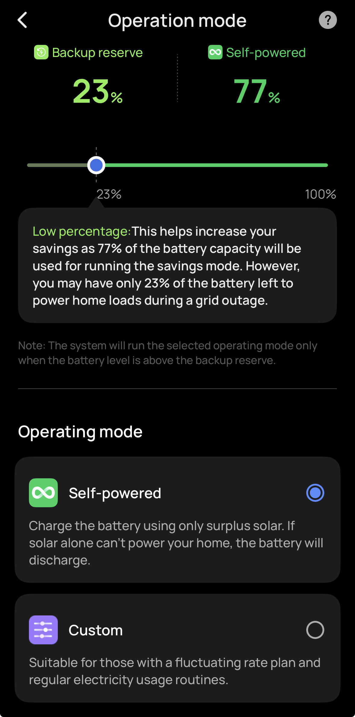 | Self-powered | 100%-Backup reserve, i.e., 100%-23% equals 77%. This means the system is ready to supply up to 77% of the total battery capacity to power your home. In my case that's 2.95kWh. |